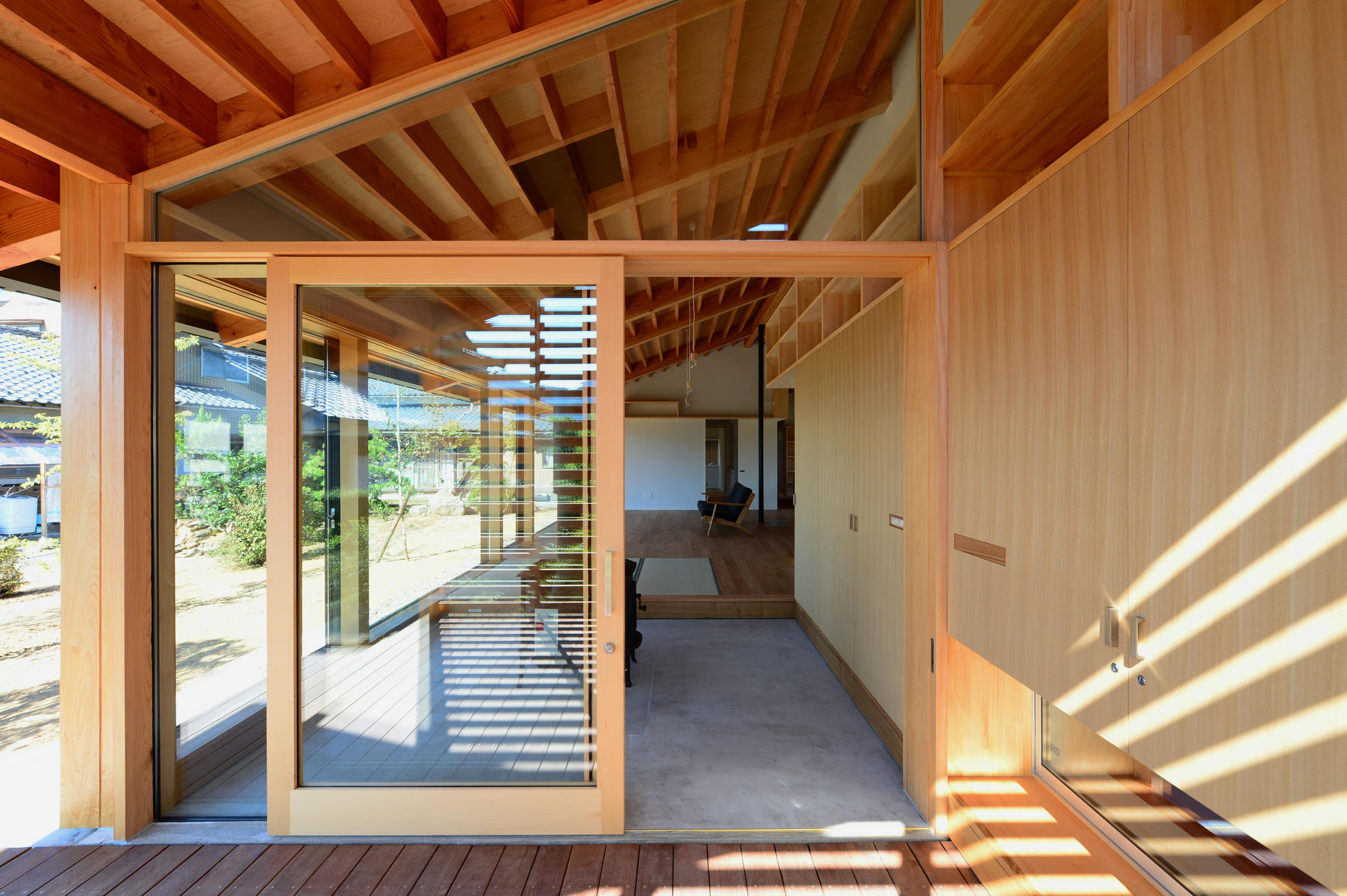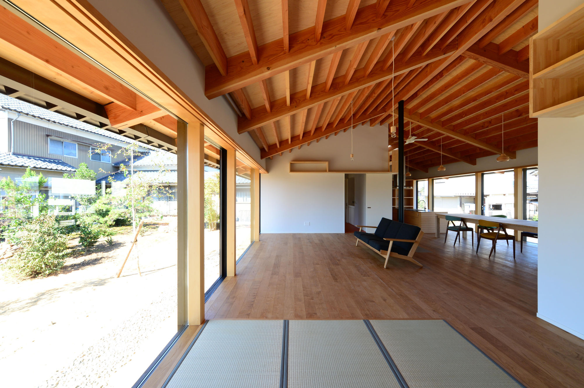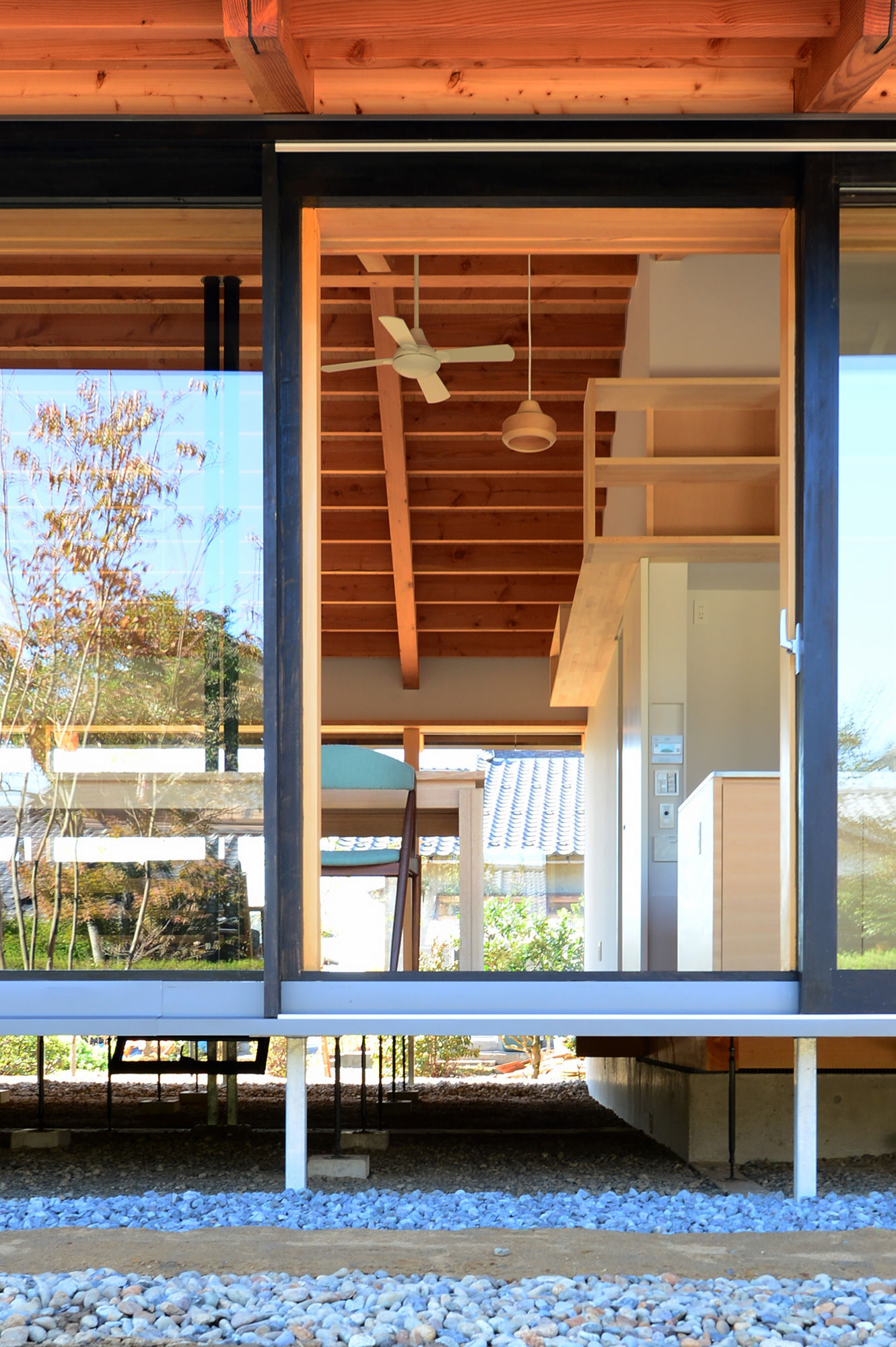 盛土をした木々の中、建物中心部を浮かすことで建物内部だけではなく外部にも庭の連続性を確保し、庭の気配や通風を遮らないようにしています。シンプルな切妻とした屋根は、積雪地の為に大きくなる構造材の構成を工夫し、軒先部分を薄くすることで夏の日射抑制と眺望の確保を両立。緩衝地帯となる縁側は設けず、北の庭と南の庭が存在感を抑えたファサードと直接繋がるようにして室内と室外の一体化を図りました。