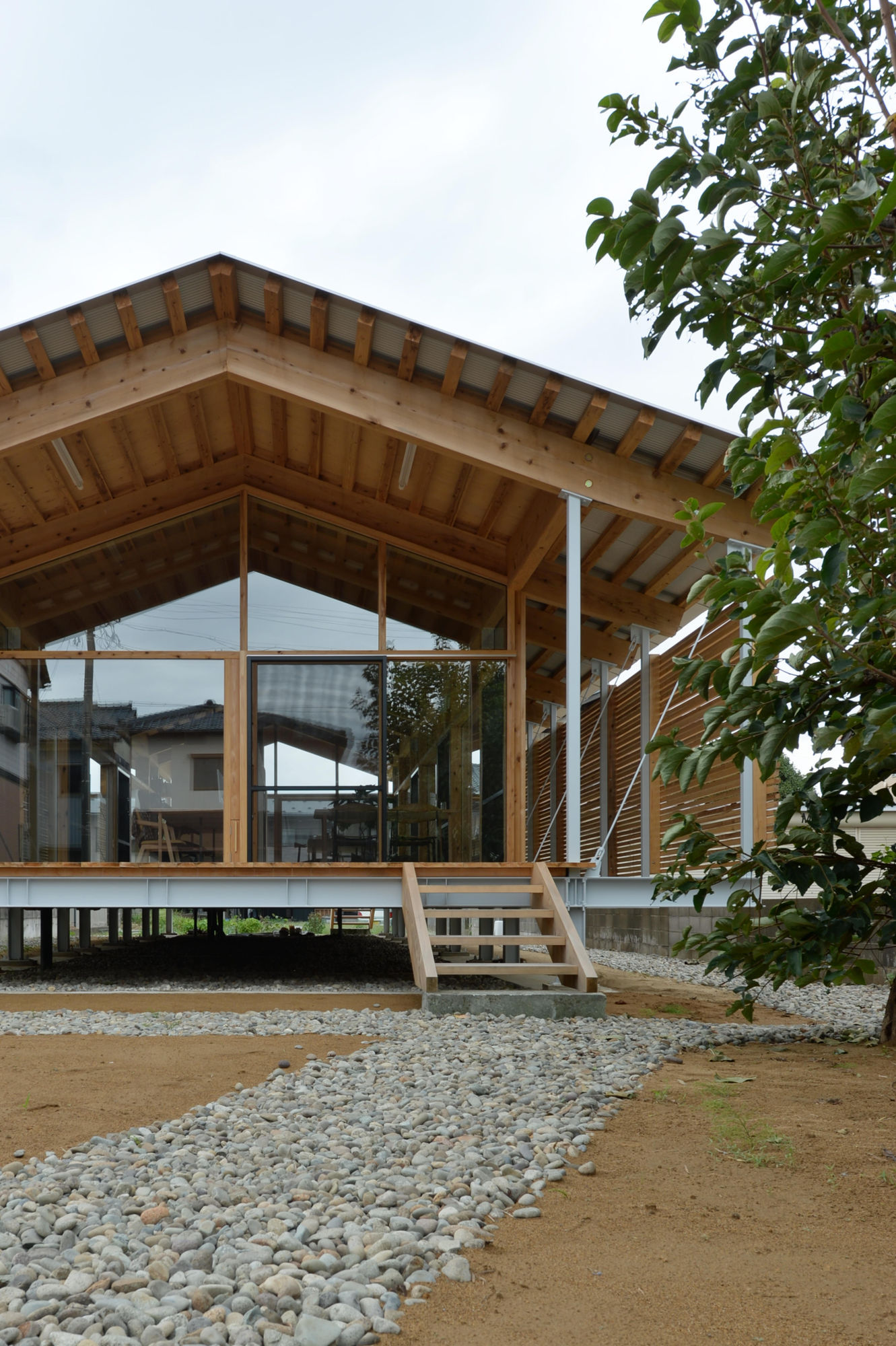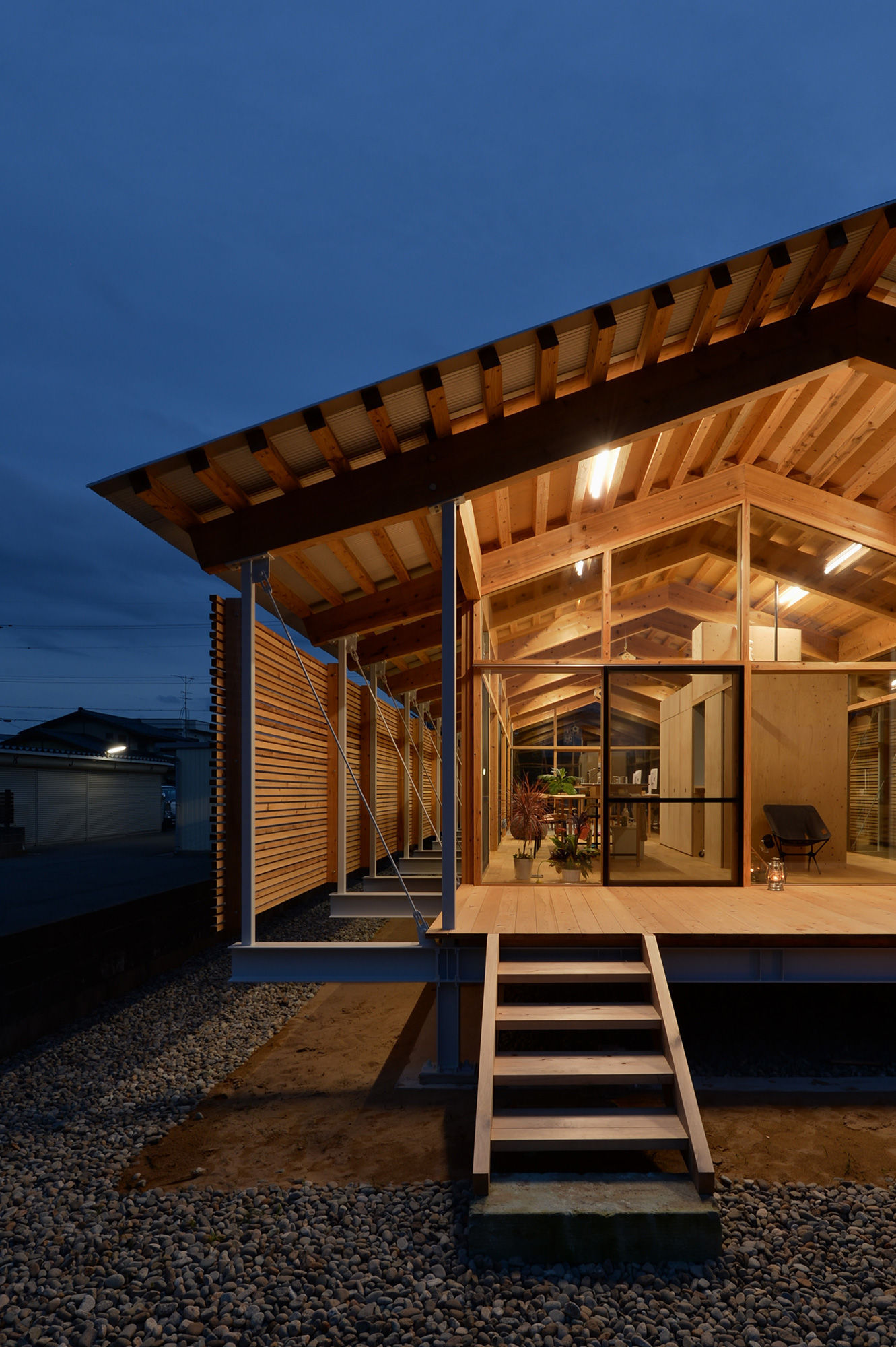 素材や表現、技術が多様化した現代建築のなか、WEBの世界を成立させている「コーディング」のように、必要なものだけを整理して積み上げていくことによって現われたもの。そんな建築をつくることができないかと考えました。建築の骨格となる架構は両端の片ブレースにより耐震壁と片持構造をつくりだし、特殊な接合金物(ホームコネクター)で剛接化した棟部によって成立した妻面のフレームを2つのピッチで構成。