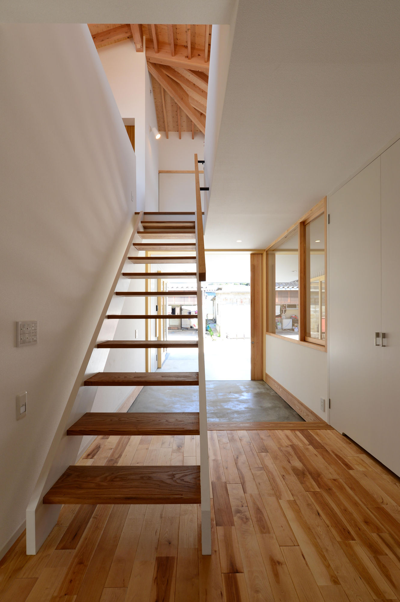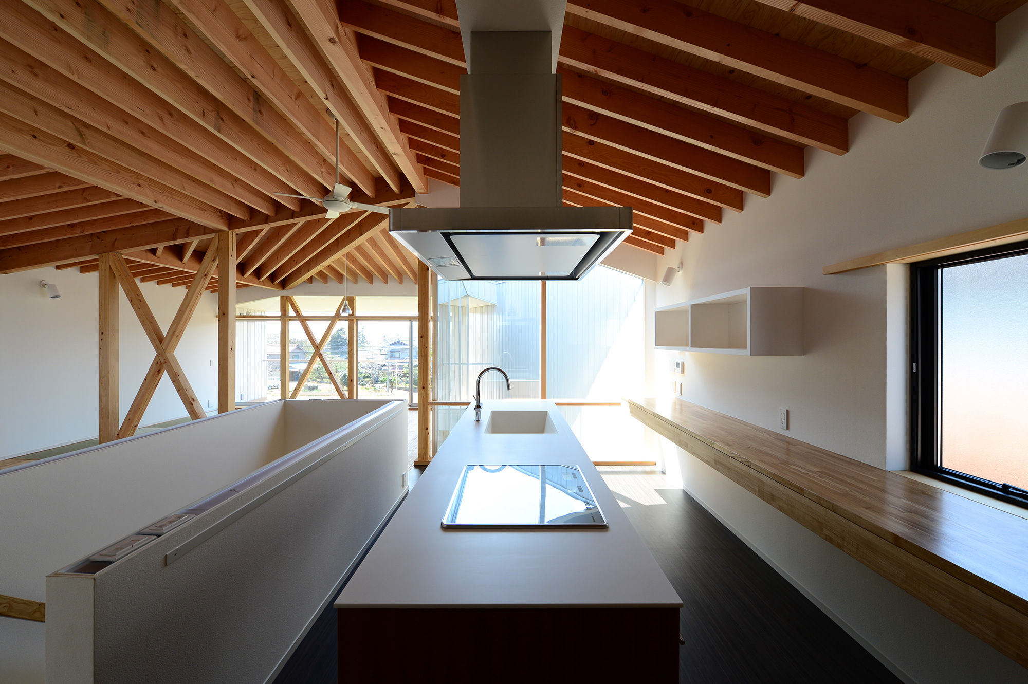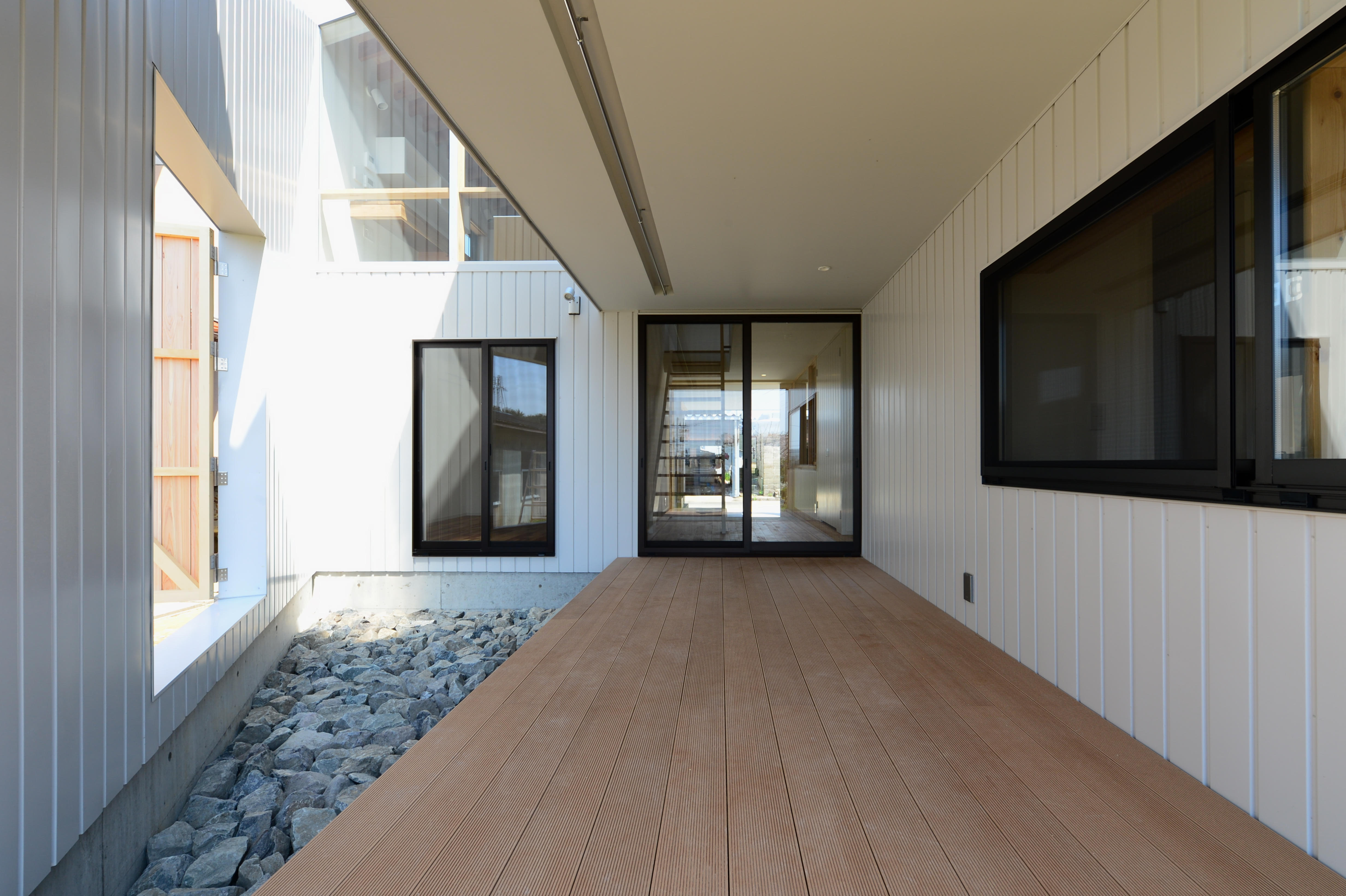 生活拠点を2階に配し、加賀の橋立方面を望む西側に大きな開口を設けることで海を望む生活が可能に。全体ボ リュームの斜に2つの外部吹抜けを内包することで、日中を通じた安定的な光の享受、通風・プライバシーを確保。外形は矩形を2か所隅切した形状。北西は隣家のサンルームへ日光が届くように配慮し、南東は駐車スペース確保の為に。2階天井は屋根架構を露出し、荷重が一部の梁に集中しないように垂木を様々な方向に架けることで梁の大きさを制御。1階はポーチ・玄関・テラスを中心軸とし、個室や仕事部屋が囲うことで効率のよい動線計画に。