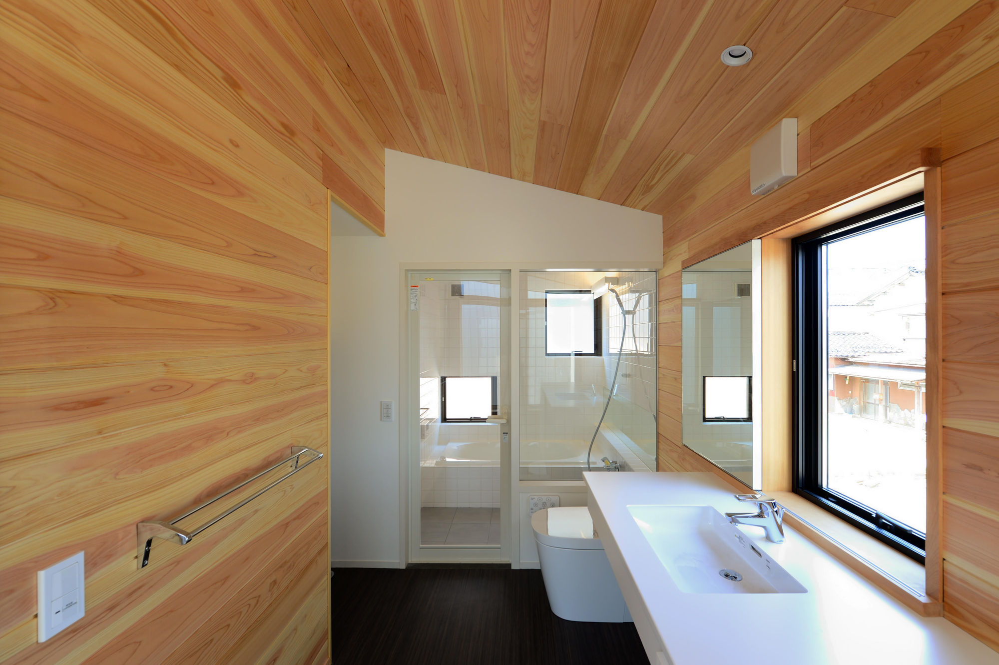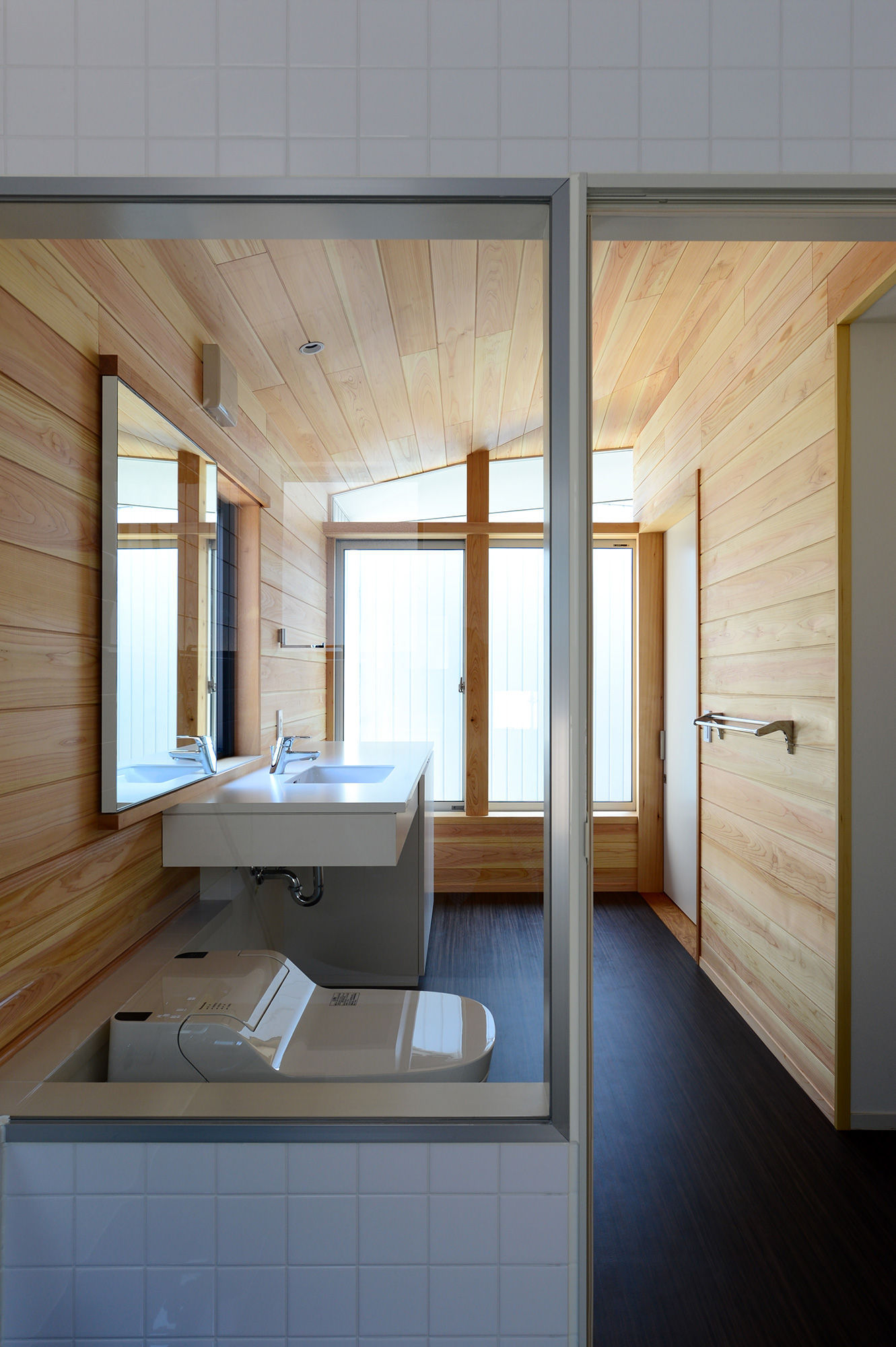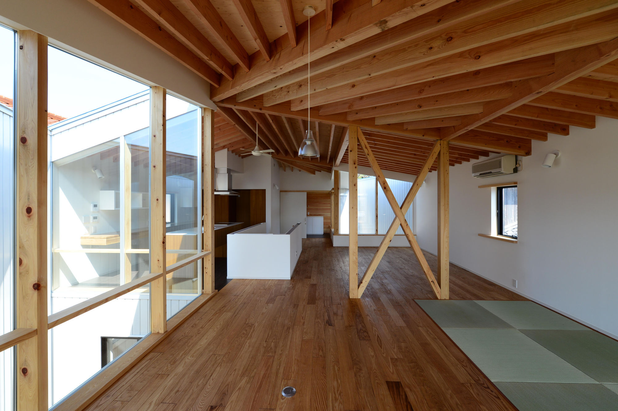 2つの外部吹抜けがもたらす反射光によって柔らかく照らされた木質天井が、2階ワンルームを優しく包みこみます。コンパクトな動線計画により、2つの外部吹抜けを持ちながらも全体ボリュームが小さくまとまっています。