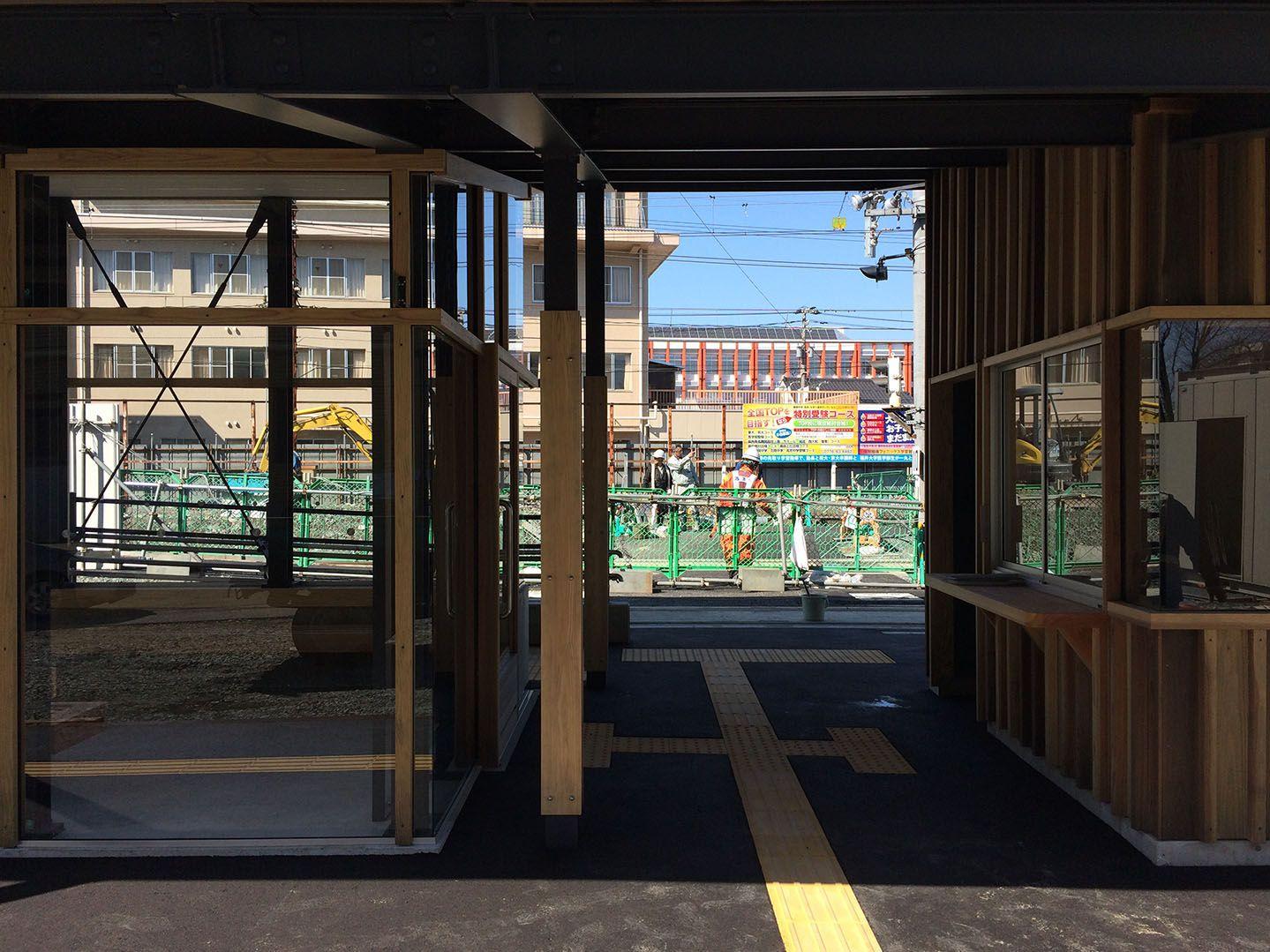 ※当事務所が担当したのは福井鉄道の駅舎の設計・監理。えちぜん鉄道の駅舎の設計(施工者によるVEの為、架構や手摺等が変更)。広場やホールは市の事業となり他の会社による設計です。